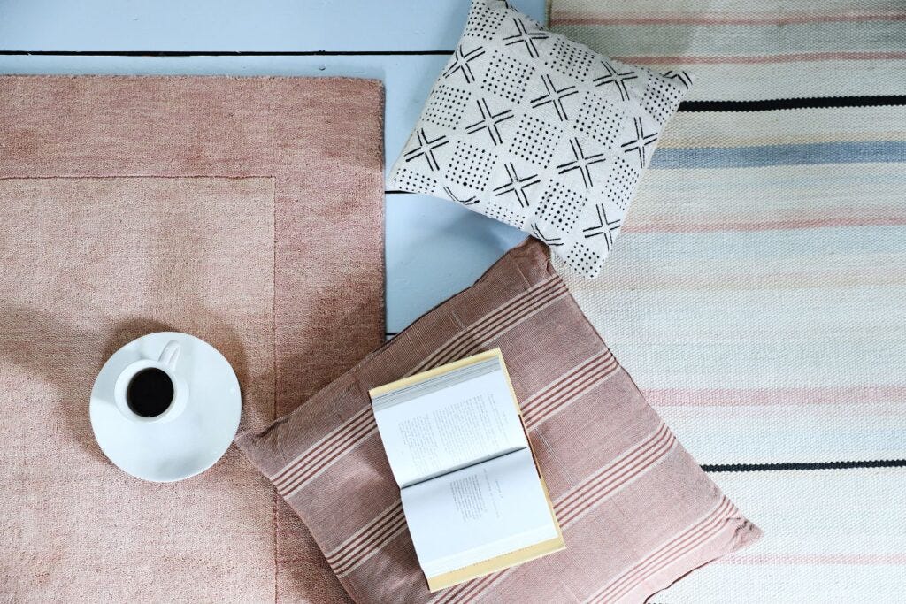 For example, in 2023, I helped launch GreenRow — a sustainable home brand that’s owned by Williams-Sonoma, Inc. Their collections are all sustainably sourced, and they work with makers I’ve known for years, including weavers and block-printers who I first met on a work trip to India in 2013. The pink rug in my office is a handwoven, 100% wool rug made by weavers who helped to start a sustainable wool supply chain in India that’s certified to the Responsible Wool Standard, which upholds animal welfare standards from the farm to the final product.