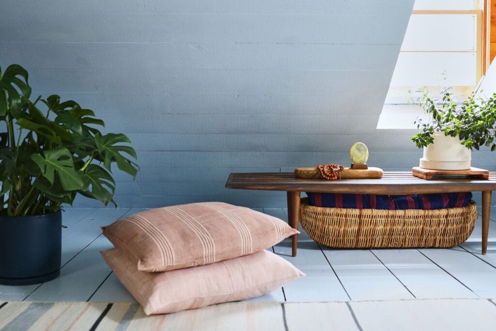 I do strength workouts in my studio with a trainer over Zoom. (I highly recommend Lindsey from Reclaiming Fitness.) For a while, I used this runner as a mat. It wasn’t very practical and would slide around, so I switched to a yoga mat. I also use the floor pillows to stretch out sometimes. When I’m really fried, I like to lay down on the floor for a few minutes to reset.